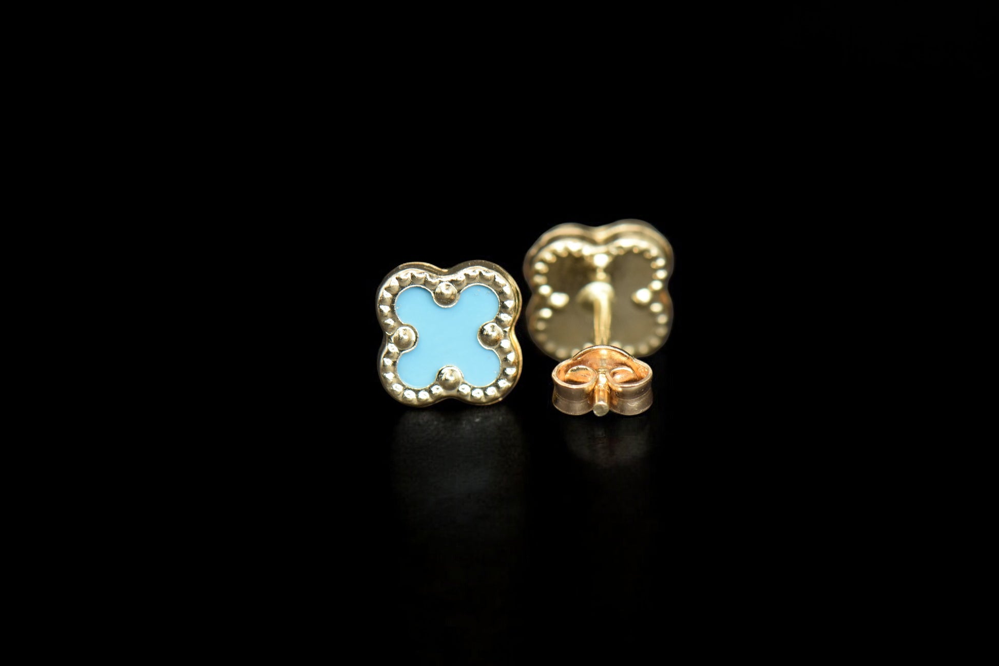 Agrega un toque de elegancia y encanto con estos Aretes de Flor Azul en Oro de 14K. Fabricados con oro genuino de 14 quilates y con un delicado diseño de flor azul, estos aretes tipo stud ofrecen el equilibrio perfecto entre un color alegre y un estilo refinado. Ideales para iluminar tu look diario o añadir un sutil toque de color a cualquier ocasión especial.